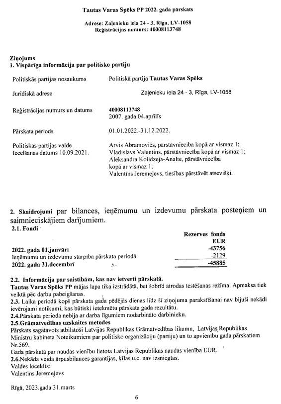 Politiskās partijas "Tautas varas spēks, Politiskā partija (Alternative, Spēks vienotībā)", reģ. Nr. 40008113748, 2022.gada pārskats