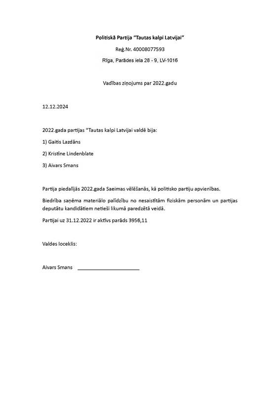 Politiskās partijas "TAUTAS KALPI LATVIJAI", reģ. Nr. 40008077593, gada pārskats par 2022. gadu, EUR