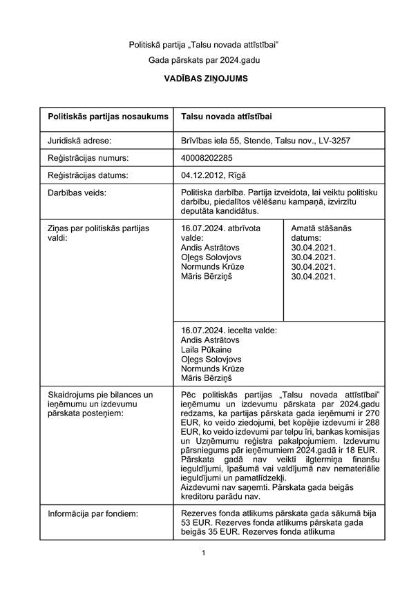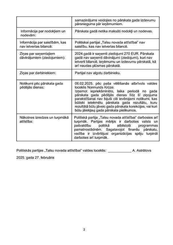 Politiskās partijas "Talsu novada attīstībai", reģ. Nr. 40008202285, gada pārskats par 2024.gadu, EUR