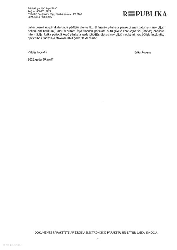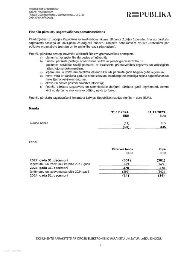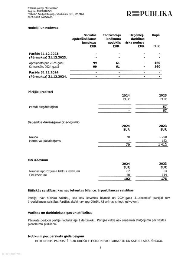 Politiskās partijas "Republika" gada pārskats par 2024. gadu, EUR