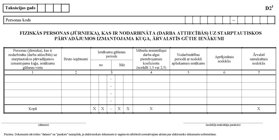18. D2 pielikumu aizpilda nodokļa maksātājs, kurš taksācijas gadā guvis ienākumus ārvalstīs, kuriem piemērojama pamatlikme. Nodokļa maksātājs, kurš ienākumus guvis vienā vai vairākās ārvalstīs, par katru citā valstī gūto ienākuma veidu aizpilda atsevišķu D2 pielikuma rindu.