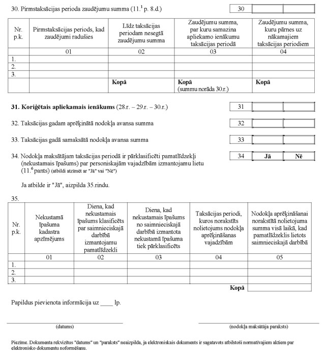 51.8. ja nodokļa maksātājs no saimnieciskās darbības ir guvis ienākumus nepilnu pirmstaksācijas gadu, aizpilda 6.2.rindu. Tajā norāda nodokļa summu, kāda tā būtu, ja nodokļa maksātājs saimniecisko darbību veiktu pilnu kalendāra gadu, un kas aprēķināta, no pirmstaksācijas perioda ar nodokli apliekamā ienākuma atņemot attiecīgos atvieglojumus, iegūto rezultātu dalot ar mēnešu skaitu, kuros veikta saimnieciskā darbība, reizinot ar 12 un reizinot ar taksācijas gadam noteikto nodokļa likmi;
