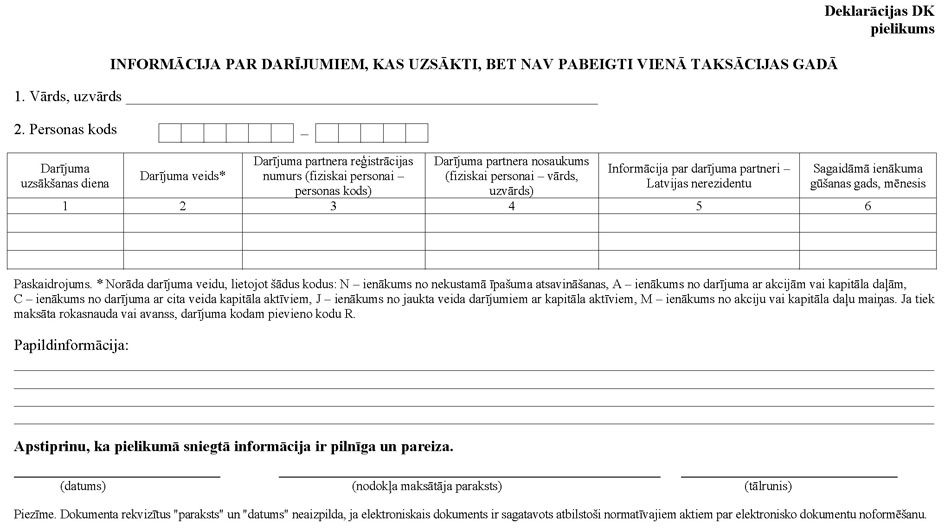 62. Nodokļa maksātājs rezidents deklarācijas DK pielikumā norāda visus taksācijas periodā uzsāktos, bet nepabeigtos darījumus ar kapitāla aktīviem Latvijas Republikā vai ārvalstīs. Nodokļa maksātājs nerezidents deklarācijas DK pielikumā norāda taksācijas periodā uzsāktos, bet nepabeigtos darījumus no Latvijas Republikā esošu kapitāla aktīvu atsavināšanas. Deklarācijas DK pielikumu par taksācijas gadu iesniedz Valsts ieņēmumu dienestā reizi gadā līdz taksācijas gadam sekojošā gada 1.jūnijam.