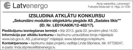 AS "RĪGAS SILTUMS" izsludina atklātu konkursu Nr. RS12/221/AK "Pretendentu kvalifikācija siltumtīklu projektēšanas darbu veikšanai, Rīgā". Iepazīties ar konkursa dokumentiem var bez maksas katru darba dienu no...