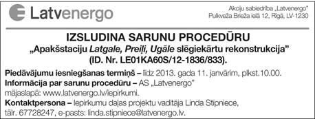Oficiālais paziņojums (OP 2012/195.PD3): piegādes un darbu izpildes pasūtījumi. Publicēts oficiālajā izdevumā "Latvijas Vēstnesis", 12.12.2012., Nr. 195 https://www.vestnesis.lv/op/2012/195.PD3