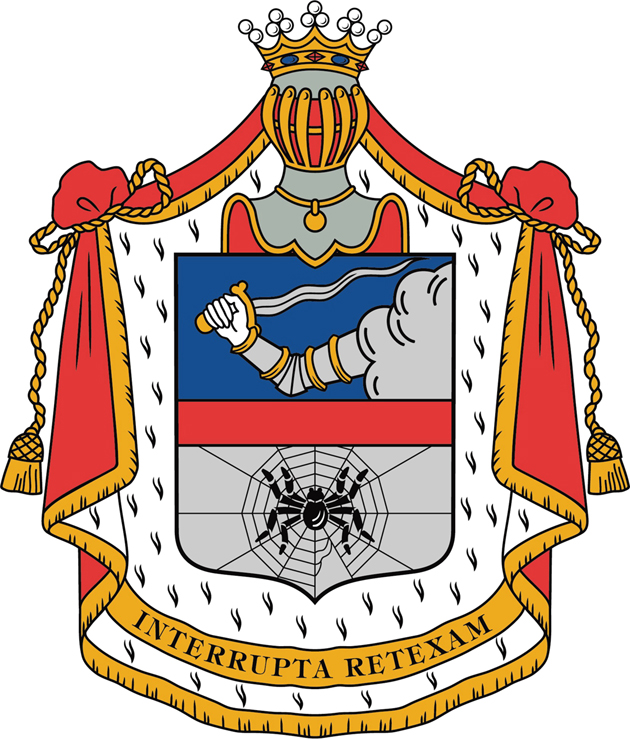 4. Biedrības Jāņa loža "Pie zobena" ģerbonis (Dalīts ar sarkanu šaursiju, augšā zilā laukā no sudraba mākoņiem kreisajā pusē izaugoša tāda pati bruņota roka ar plaukstu baltā cimdā, kas tur zobenu ar viļņotu sudraba asmeni un zelta rokturi. Apakšā sudraba laukā zirnekļa tīkls ar melnu zirnekli centrā. Stīpu ķivere kronēta ar zelta piecžuburu kroni, sarkana mantija ar sermuļādas oderi, zelta bārkstīm un pušķiem. Apakšā uz mantijas zelta lente ar devīzi INTERRUPTA RETEXAM) – reģistrēts 2013.gada 21.maijā (4.pielikums);