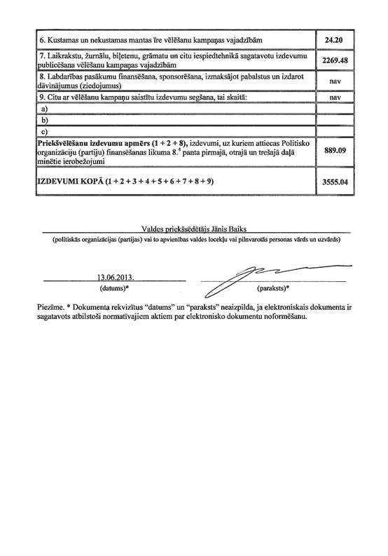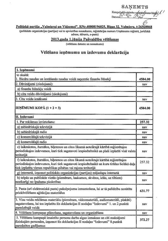 Politiskās partijas "Valmierai un Vidzemei" 2013.gada 1.jūnija pašvaldību vēlēšanu ieņēmumu un izdevumu deklarācija