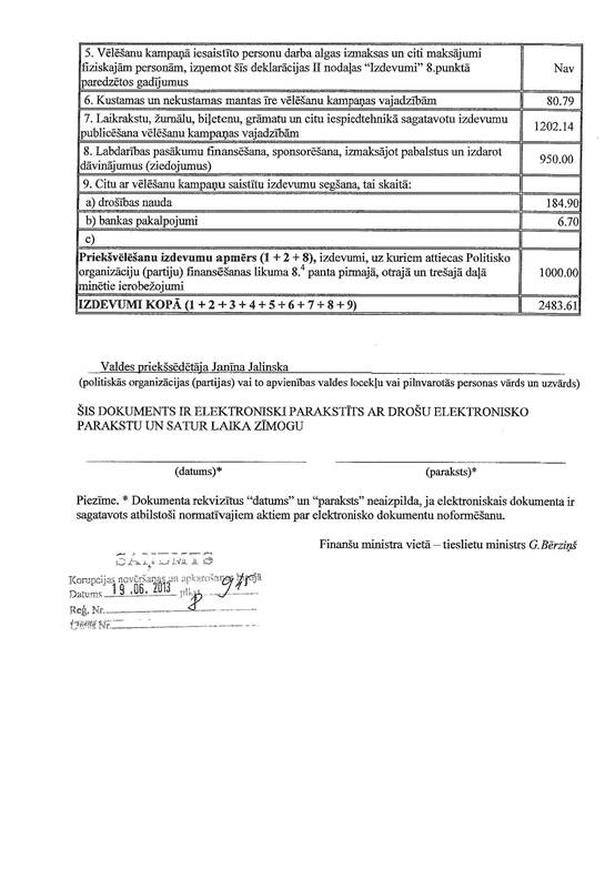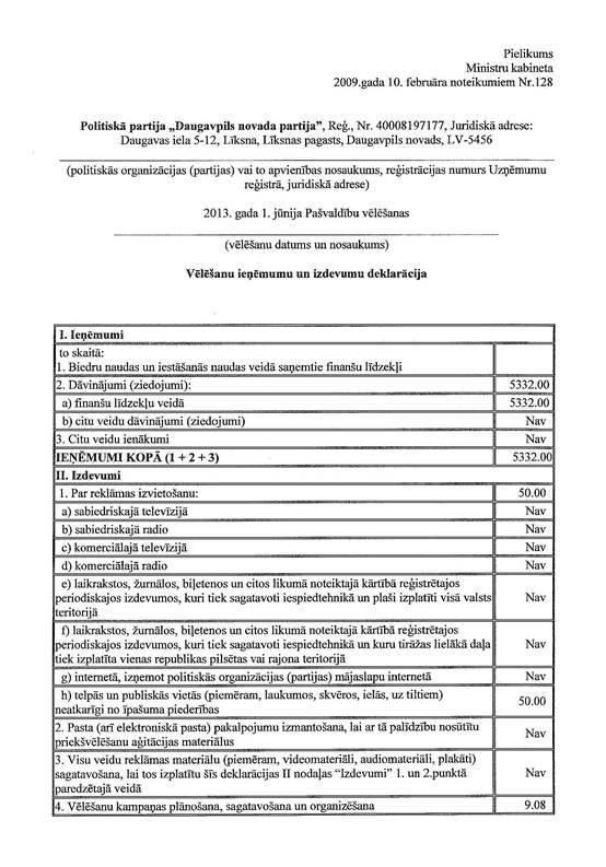 Politiskās partijas "Daugavpils novada partija" 2013.gada 1.jūnija pašvaldību vēlēšanu ieņēmumu un izdevumu deklarācija