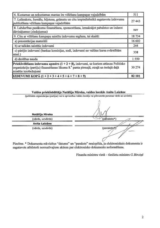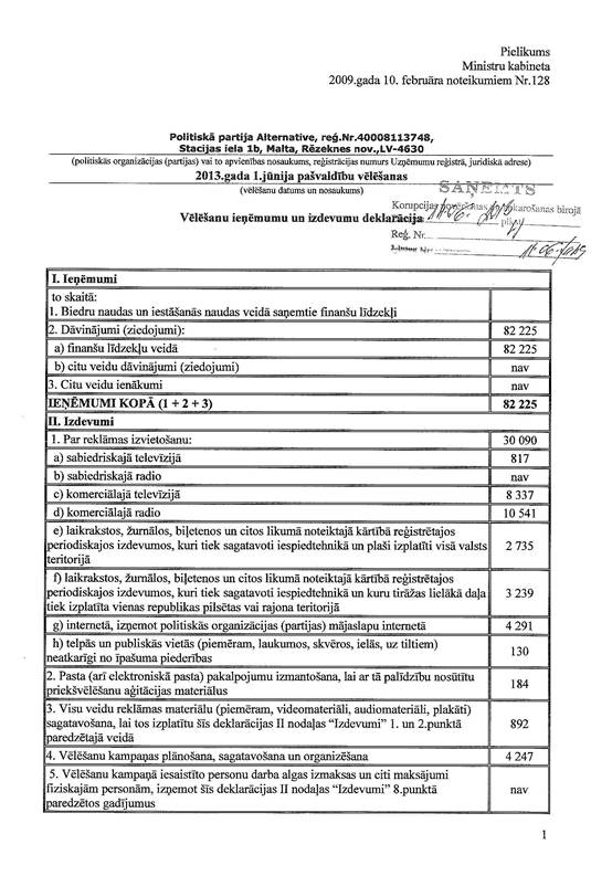 Politiskās partijas "Alternative" 2013.gada 1.jūnija pašvaldību vēlēšanu ieņēmumu un izdevumu deklarācija