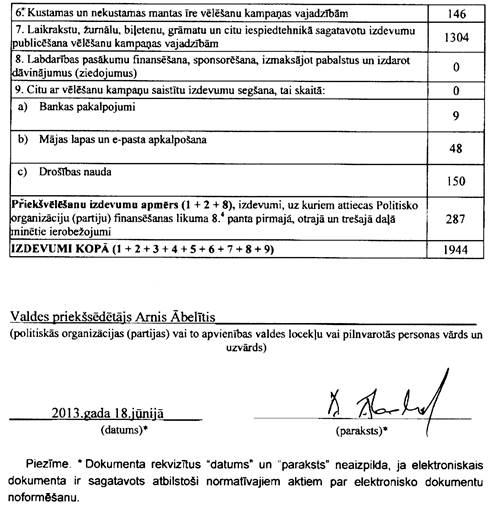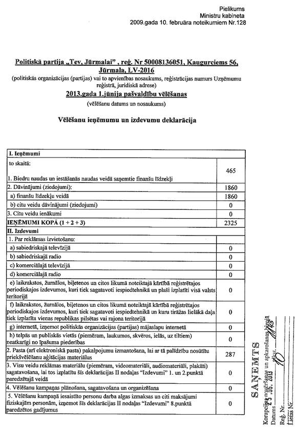 Politiskās partijas "Tev, Jūrmalai", reģ.Nr.50008136051, 2013.gada 1.jūnija pašvaldību vēlēšanu ieņēmumu un izdevumu deklarācija