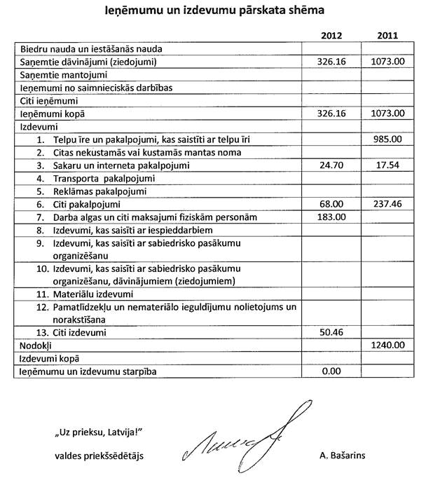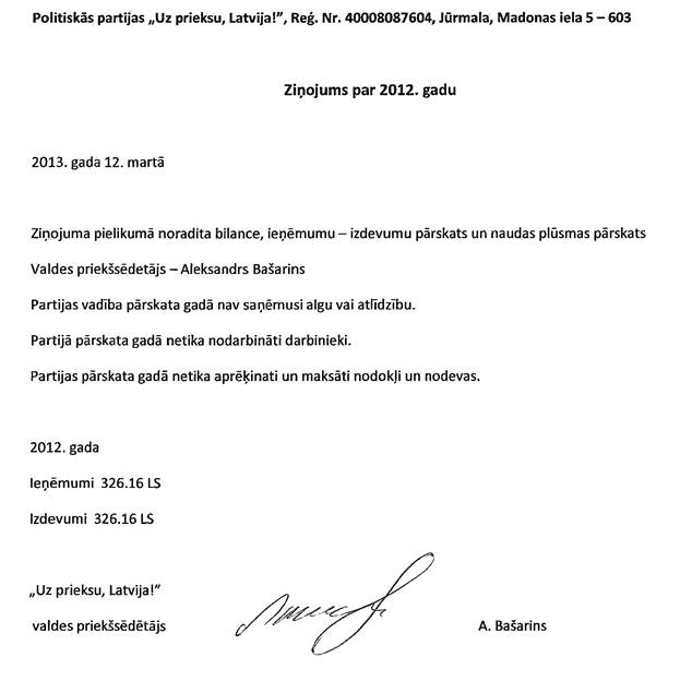 Politiskā partija "Uz priekšu, Latvija!", reģ.Nr.40008087604, gada pārskats par 2012.gadu