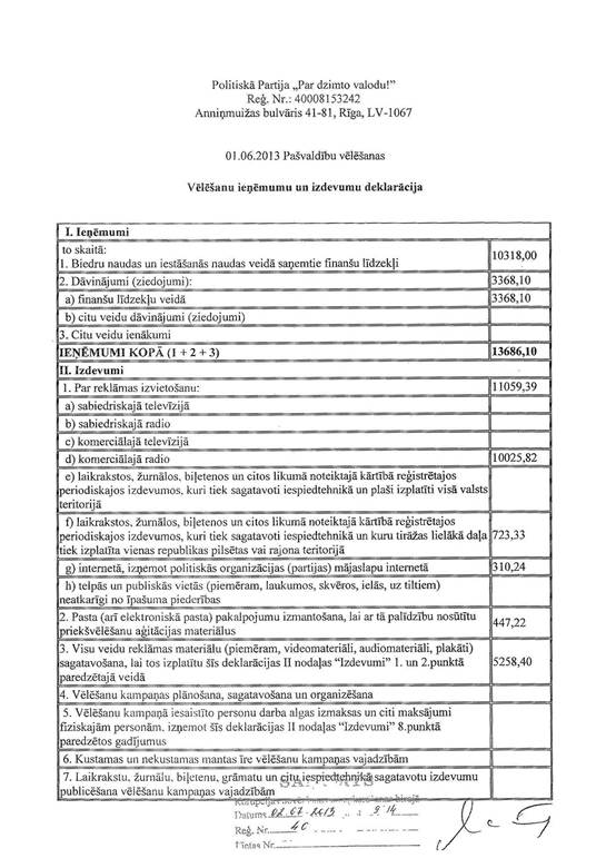 Politiskās partijas "Par dzimto valodu!" 2013.gada 2.jūlijā iesniegtā 2013.gada 1.jūnija pašvaldību vēlēšanu ieņēmumu un izdevumu deklarācija