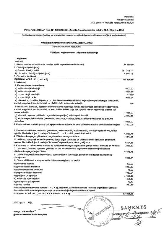Politiskās partijas "Partija "Vienotība"" 2013.gada 1.jūlijā iesniegtā 2013.gada 1.jūnija pašvaldību vēlēšanu ieņēmumu un izdevumu deklarācija