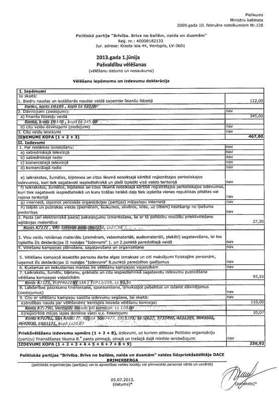 Politiskās partijas "Brīvība. Brīvs no bailēm, naida un dusmām" 2013.gada 8.jūlijā iesniegtā 2013.gada 1.jūnija pašvaldību vēlēšanu ieņēmumu un izdevumu deklarācija