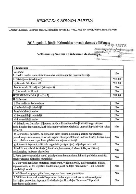 Politiskās partijas "KRIMULDAS NOVADA PARTIJA" 2013.gada 1.jūlijā elektroniski iesniegtā 2013.gada 1.jūnija pašvaldību vēlēšanu ieņēmumu un izdevumu deklarācija