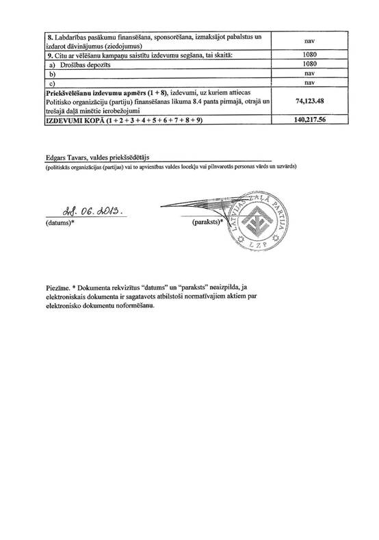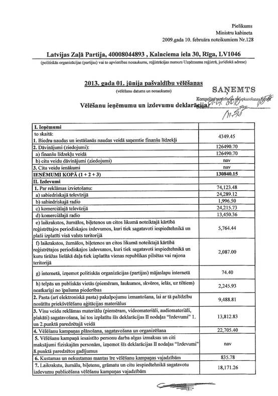 Politiskās partijas "Latvijas Zaļā partija" 2013.gada 1.jūlijā iesniegtā 2013.gada 1.jūnija pašvaldību vēlēšanu ieņēmumu un izdevumu deklarācija