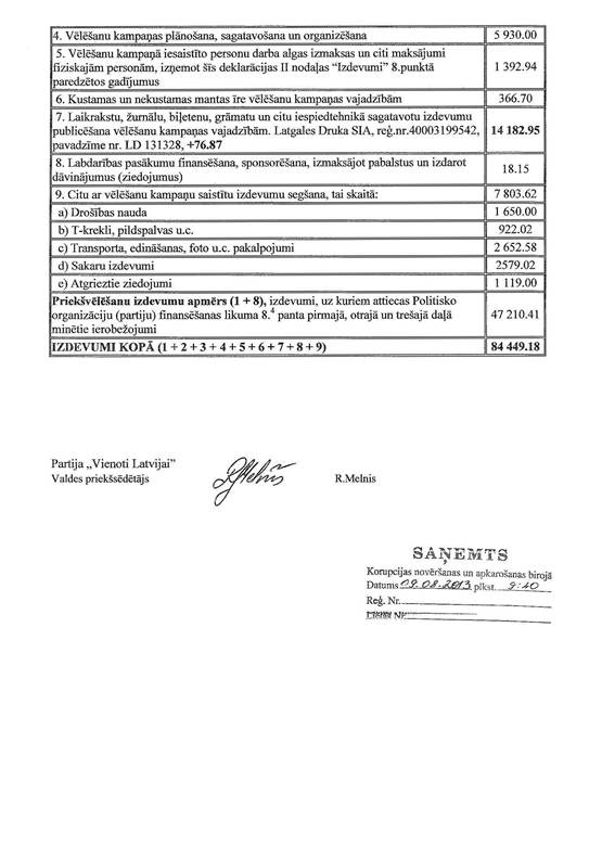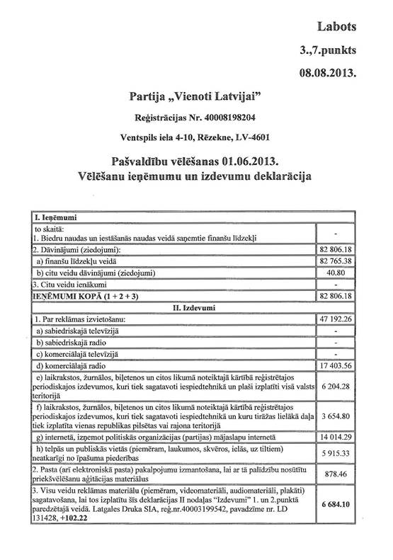 Politiskās partijas "Partija "Vienoti Latvijai"" precizēta 2013.gada 1.jūnija pašvaldību vēlēšanu ieņēmumu un izdevumu deklarācija