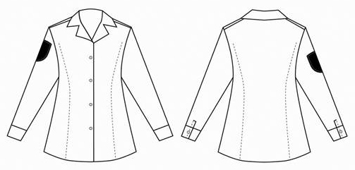 12. Sieviešu blūze – pieguloša silueta blūze ar četru pogu (diametrs – 11 mm) aizdari. Angļu tipa apkakle. Uz plecu vīlēm – uzpleči ar vienu pogu un dienesta pakāpes zīmēm. Uz labās piedurknes – uzšuve. Iešūtas vienvīles īsās (1.pielikuma 14.attēls) un garās piedurknes (1.pielikuma 15.attēls). Blūzei ar garām piedurknēm – aproce ar vienas pogas aizdari.