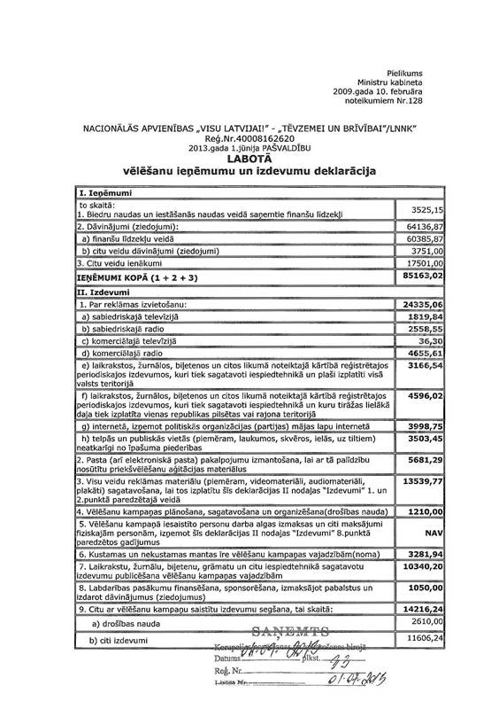 Politisko partiju apvienības "Nacionālā apvienība "Visu Latvijai!" - "Tēvzemei un Brīvībai/LNNK"" precizēta 2013.gada 1.jūnija pašvaldību vēlēšanu ieņēmumu un izdevumu deklarācija