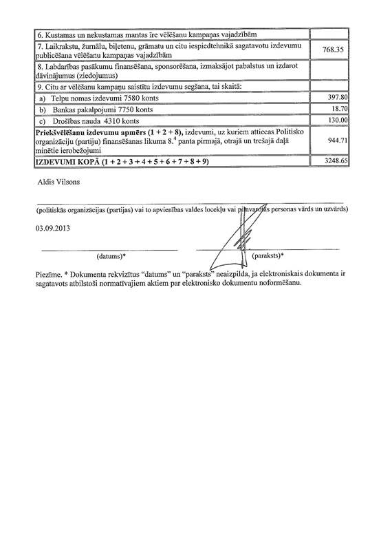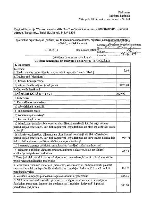 Politiskās partijas "Talsu novada attīstībai" precizēta 2013.gada 1.jūnija pašvaldību vēlēšanu ieņēmumu un izdevumu deklarācija