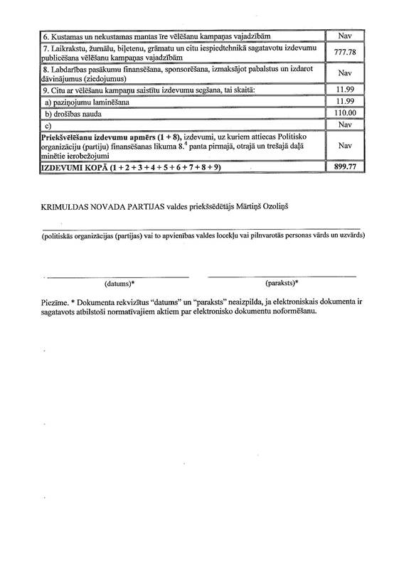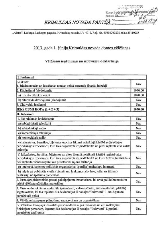 Politiskās partijas "KRIMULDAS NOVADA PARTIJA" precizēta 2013.gada 1.jūnija pašvaldību vēlēšanu ieņēmumu un izdevumu deklarācija