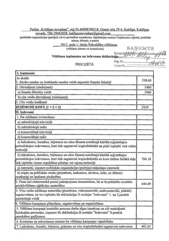 Politiskās partijas "Kuldīgas novadam" precizēta 2013.gada 1.jūnija pašvaldību vēlēšanu ieņēmumu un izdevumu deklarācija