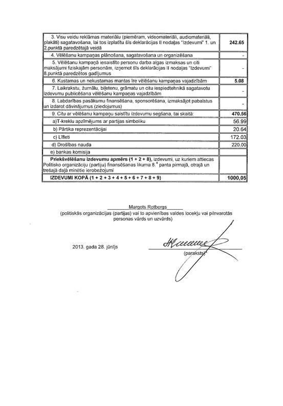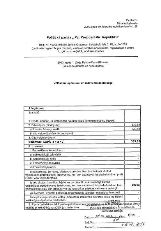 Politiskās partijas "Par prezidentālu republiku" precizēta 2013.gada 1.jūnija pašvaldību vēlēšanu ieņēmumu un izdevumu deklarācija