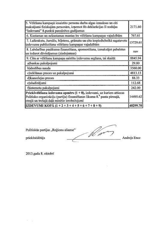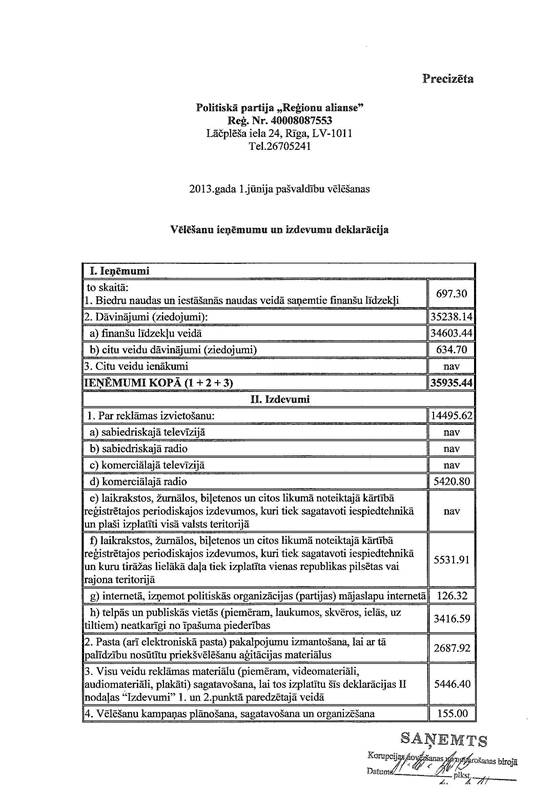 Politiskās partijas "Reģionu alianse" precizēta 2013.gada 1.jūnija pašvaldību vēlēšanu ieņēmumu un izdevumu deklarācija