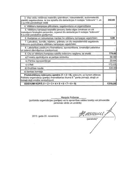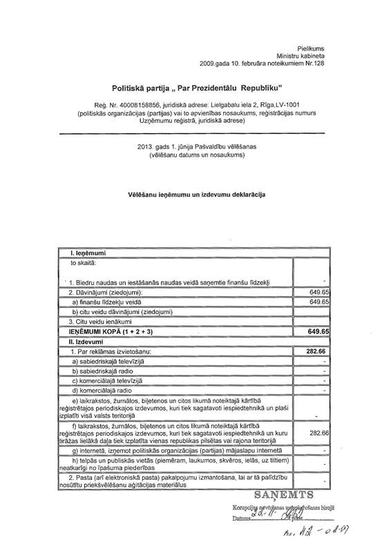Politiskās partijas "Par Prezidentālu Republiku" precizēta 2013.gada 1.jūnija pašvaldību vēlēšanu ieņēmumu un izdevumu deklarācija