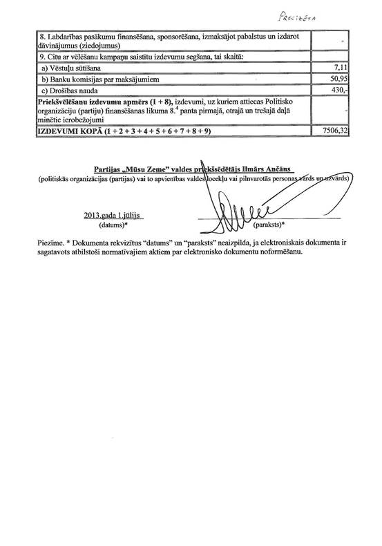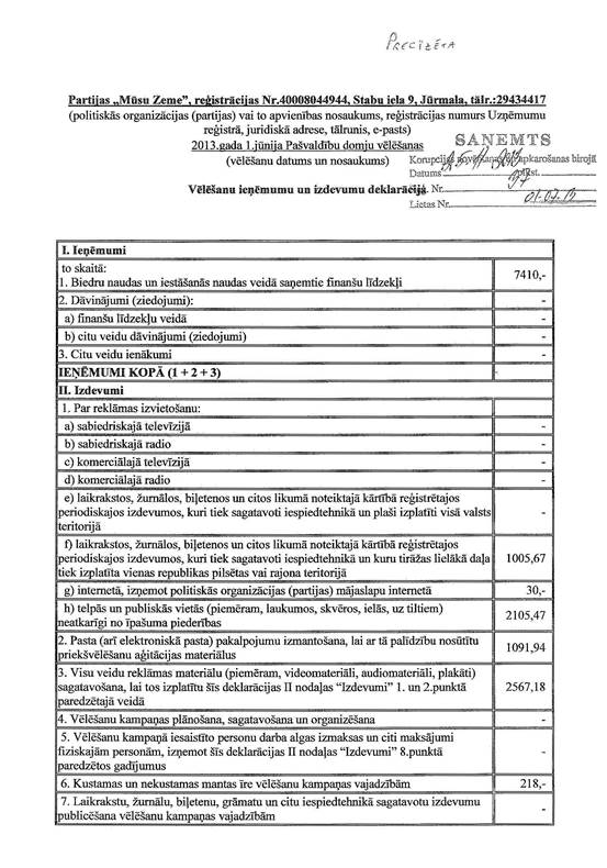 Politiskās partijas "Mūsu Zeme" precizēta 2013.gada 1.jūnija pašvaldību vēlēšanu ieņēmumu un izdevumu deklarācija