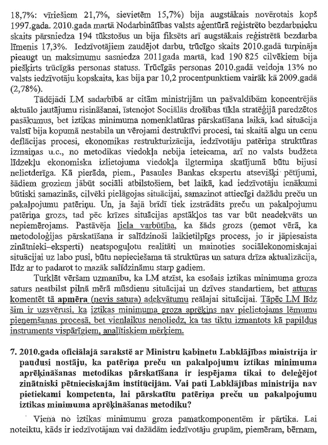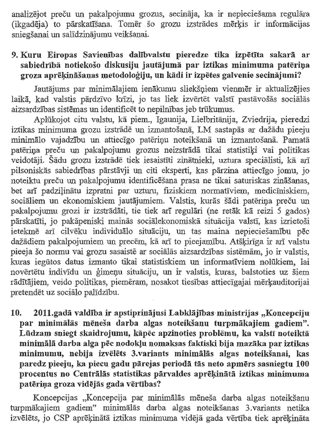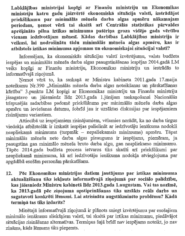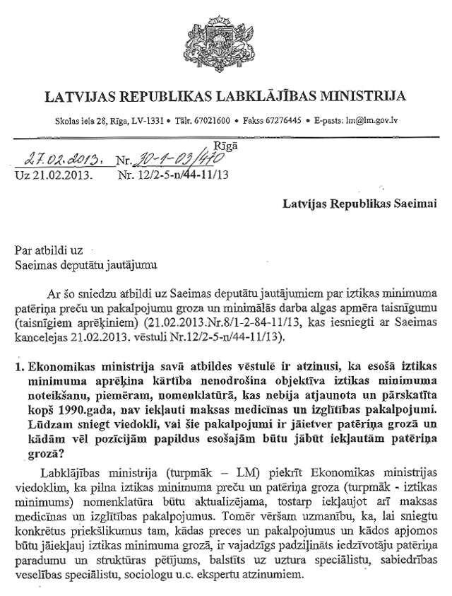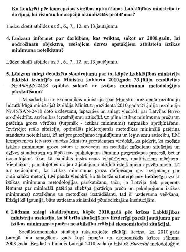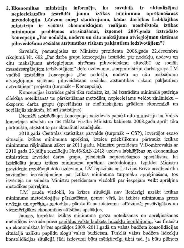 Sēdes vadītājs. Labdien! Sākam atbilžu sniegšanu uz deputātu jautājumiem. Šodien darba kārtībā ir viens deputātu jautājums. Iesniedzēji ir Zariņš, Tutins, Jakimovs, Agešins un Ribakovs, un jautājums bija labklājības ministrei Ilzei Viņķelei "Par iztikas minimuma patēriņa preču un pakalpojumu groza un minimālās darba algas apmēra taisnīgumu (taisnīgiem aprēķiniem)".