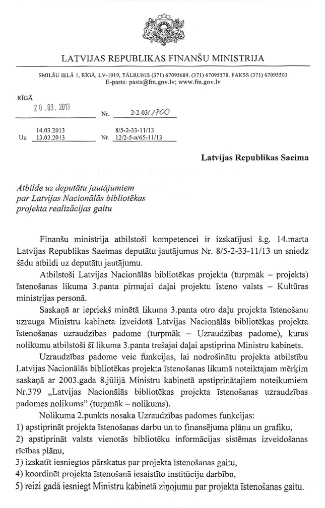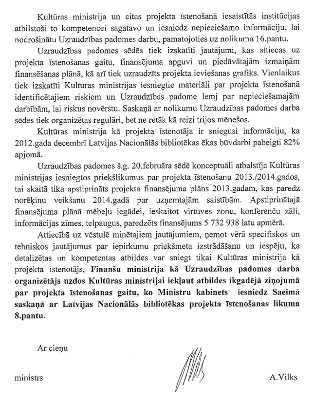 Daudzi no jums ir bijuši Latvijas Nacionālajā bibliotēkā, un pagājušajā nedēļā mēs bijām kopā ar "Saskaņas Centra" deputātiem Latvijas Nacionālajā bibliotēkā, un jūs redzējāt, ka bibliotēka ir finiša taisnē. Mēs šobrīd bibliotēku jau gatavojam Eiropas prezidentūrai, lai 2015.gadā tā būtu Eiropas prezidentūras birojs.