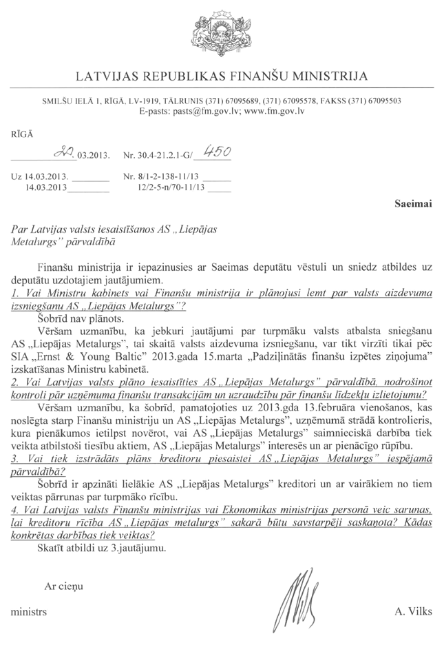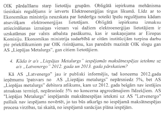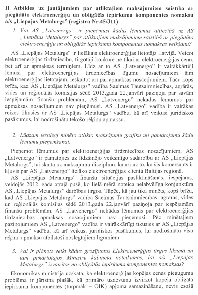 Ir saņemts arī deputātu Elksniņa, Cvetkovas, Urbanoviča, Agešina un Rubika jautājums ekonomikas ministram Danielam Pavļutam "Par akciju sabiedrības "Citadele banka" izsniegto kredītu akciju sabiedrībai "Liepājas metalurgs"". Arī šis jautājums tiks nodots ekonomikas ministram.