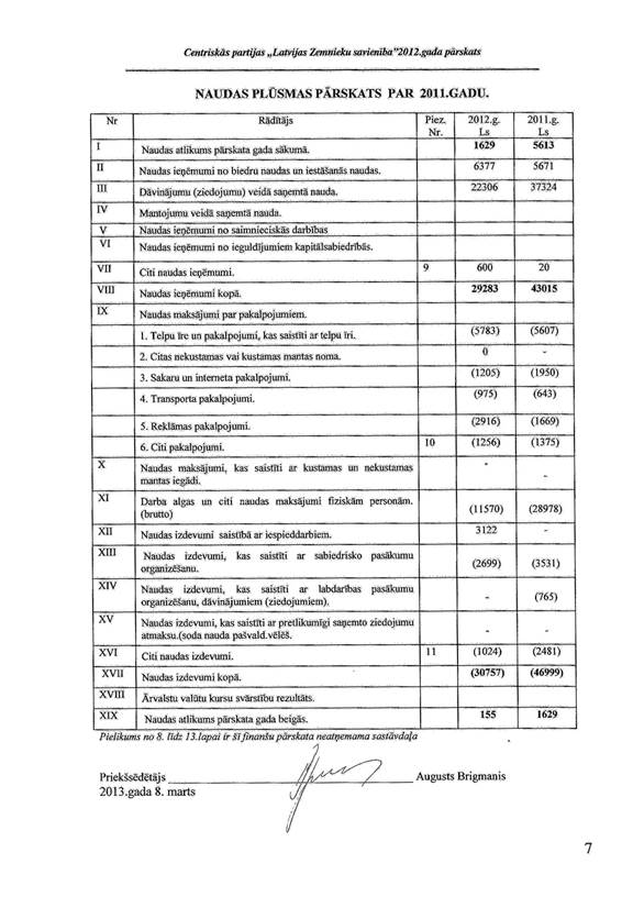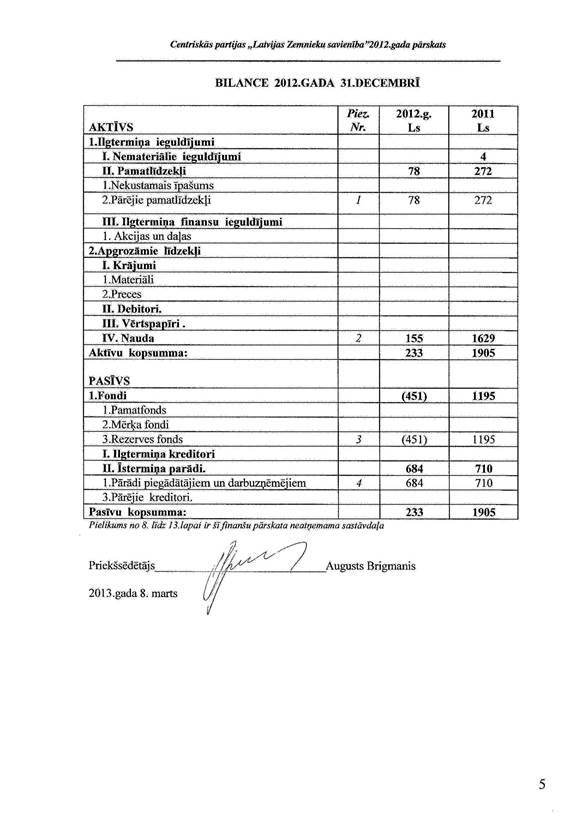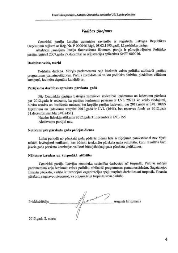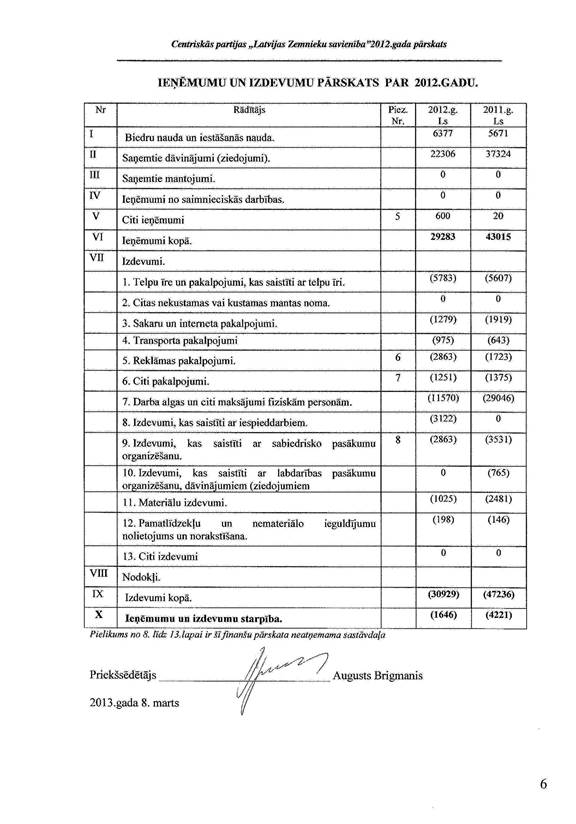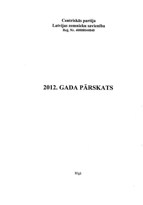 Politiskās partijas "Centriskā partija Latvijas zemnieku savienība" 2012.gada pārskats