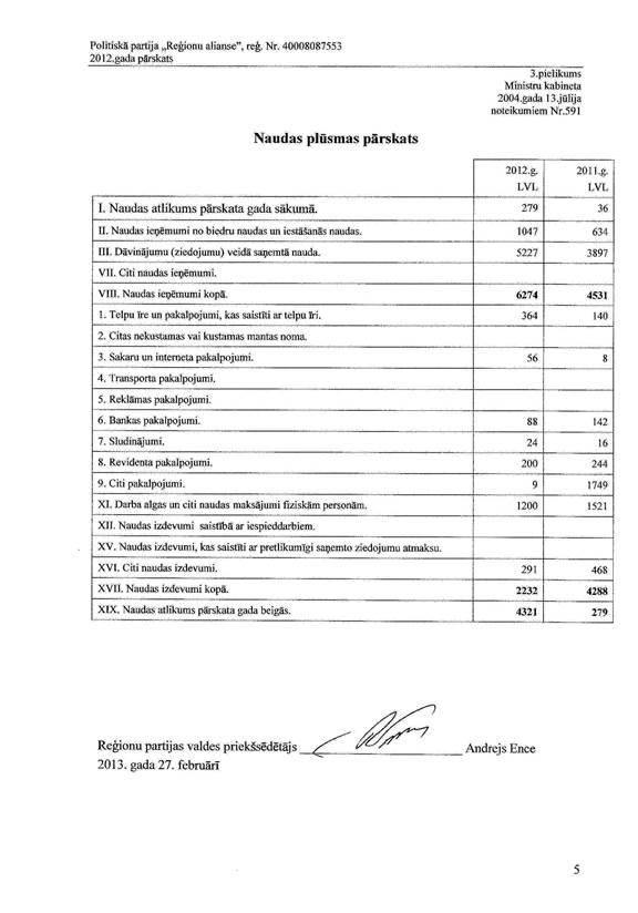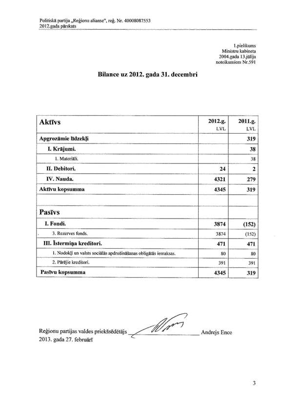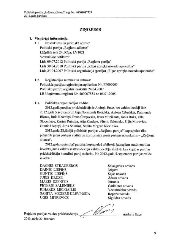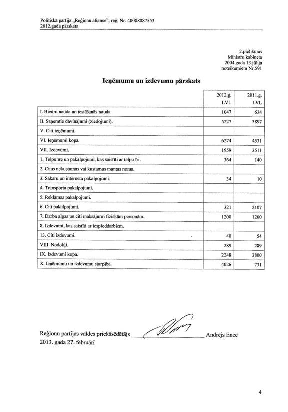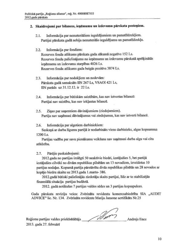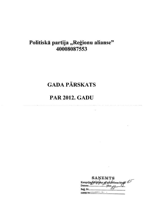Politiskās partijas "Reģionu alianse" 2012.gada pārskats
