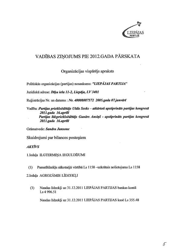 Politiskās partijas "Liepājas partija" 2012.gada pārskats