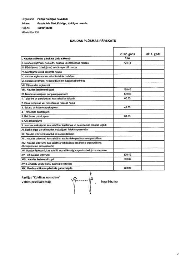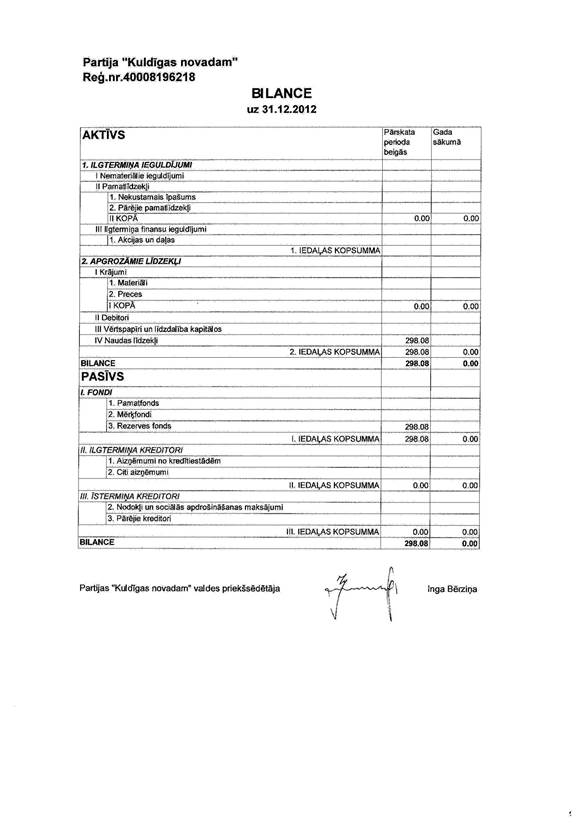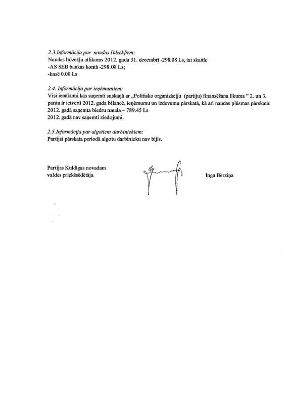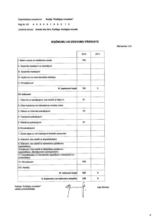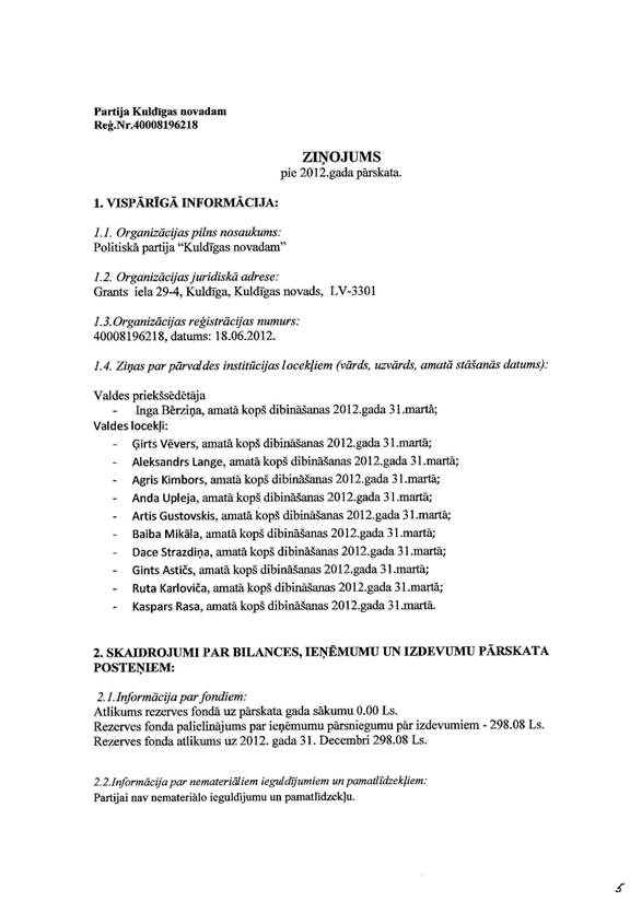 Politiskās partijas "Kuldīgas novadam" gada pārskats par 2012.gadu