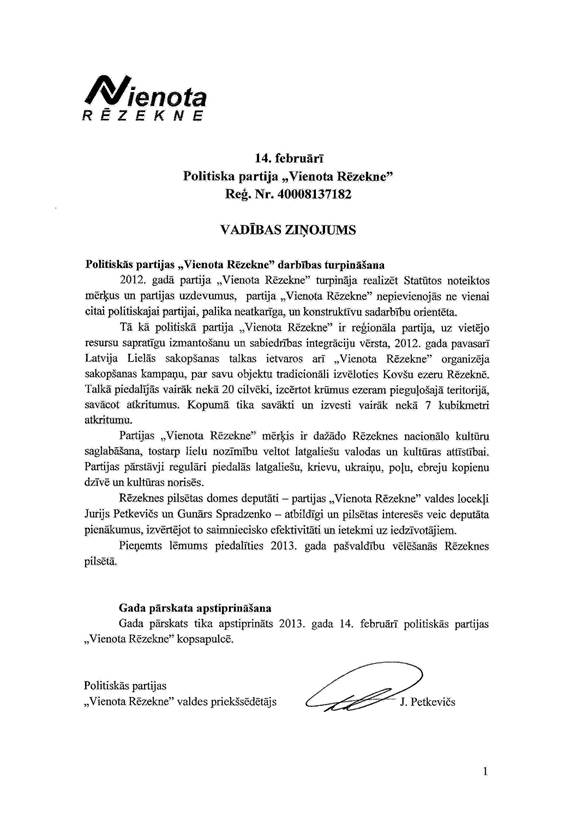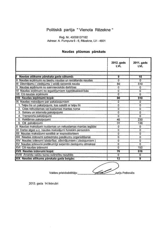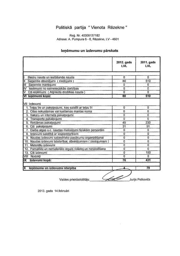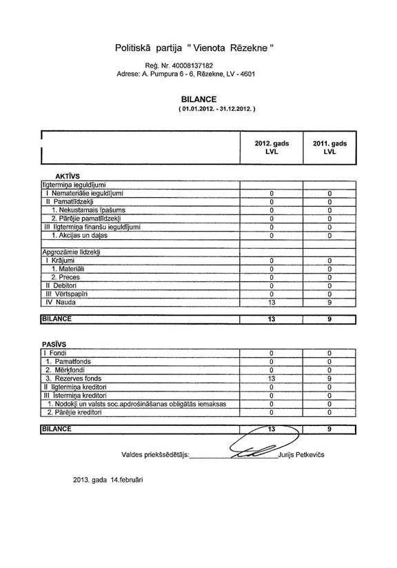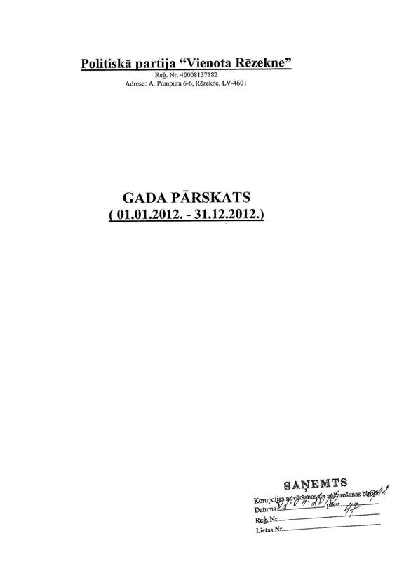 Politiskās partijas "Vienota Rēzekne" gada pārskats par 2012.gadu
