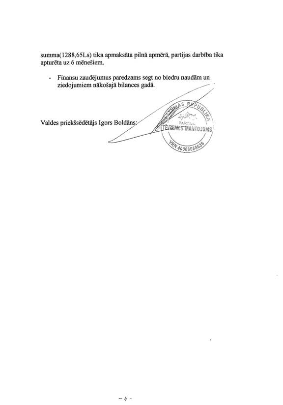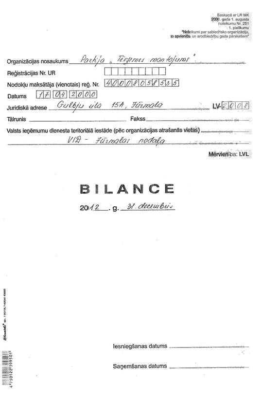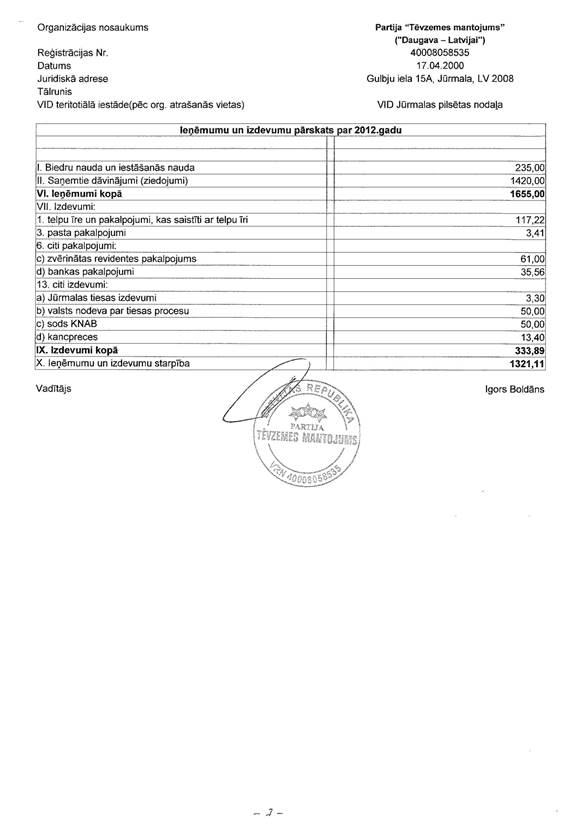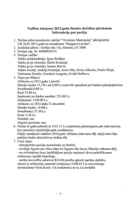 Politiskās partijas "Tēvzemes mantojums" gada pārskats par 2012.gadu
