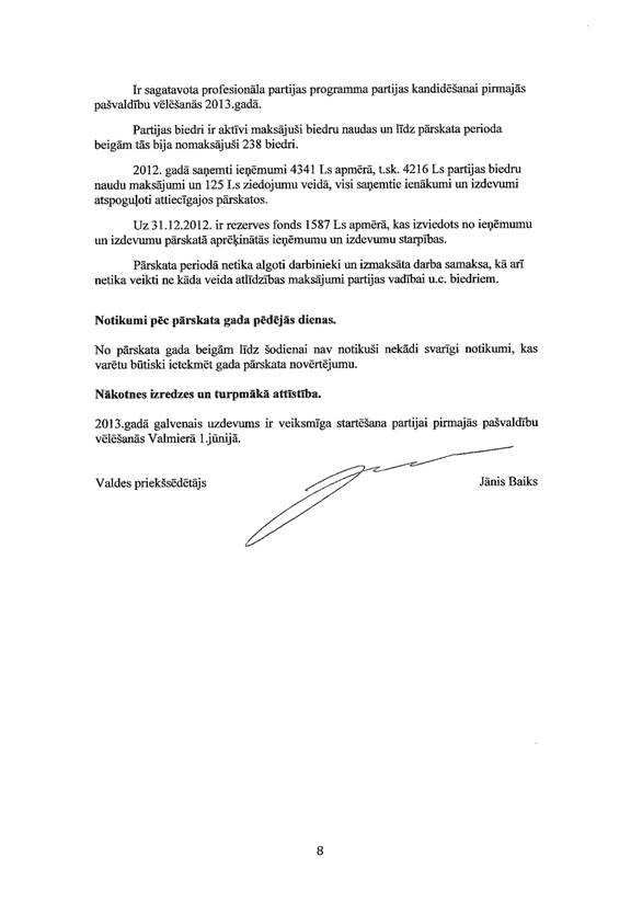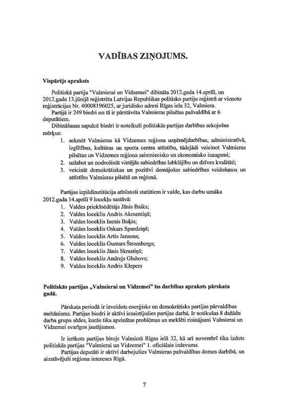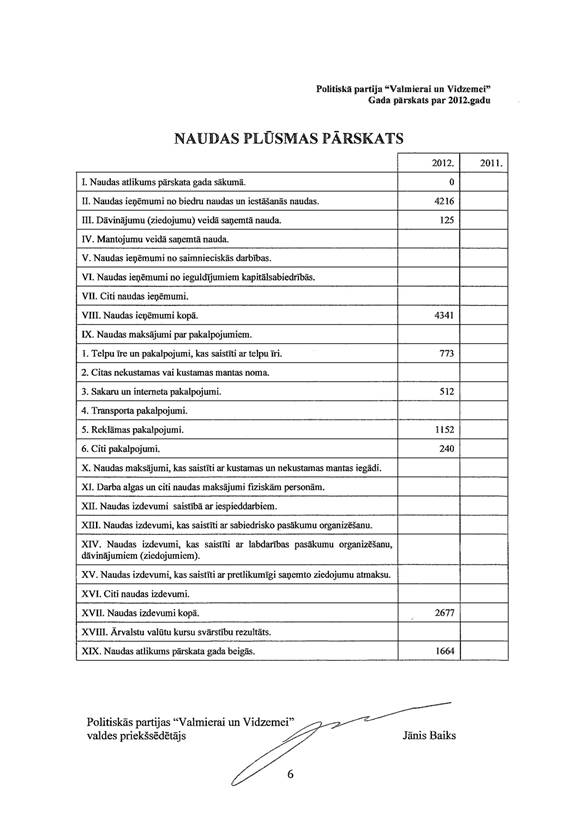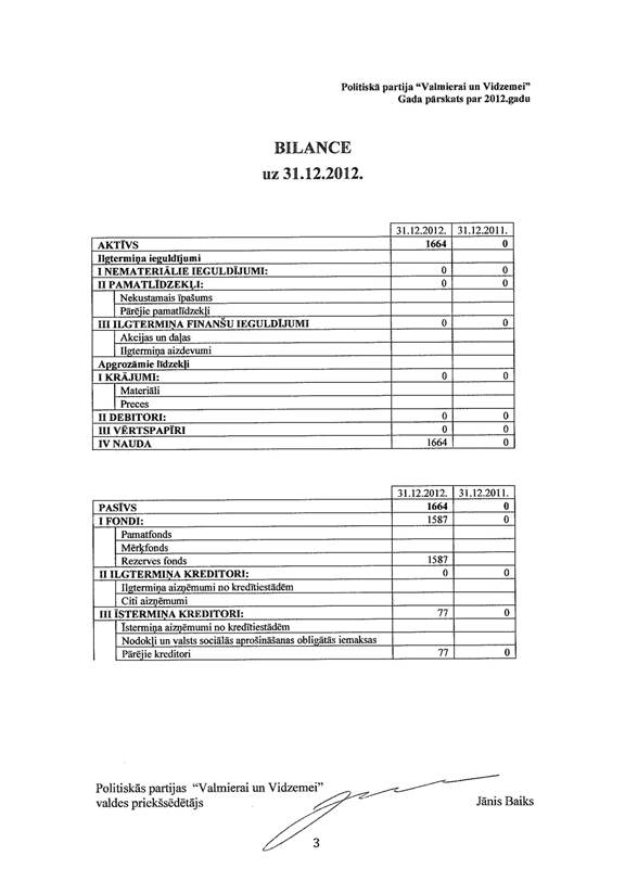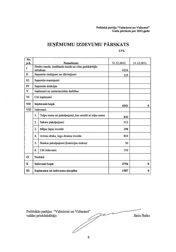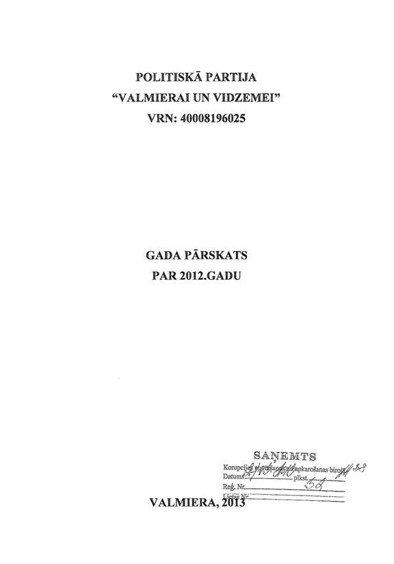 Politiskās partijas "Valmierai un Vidzemei" gada pārskats par 2012.gadu