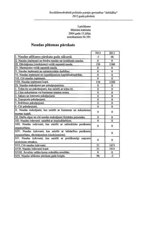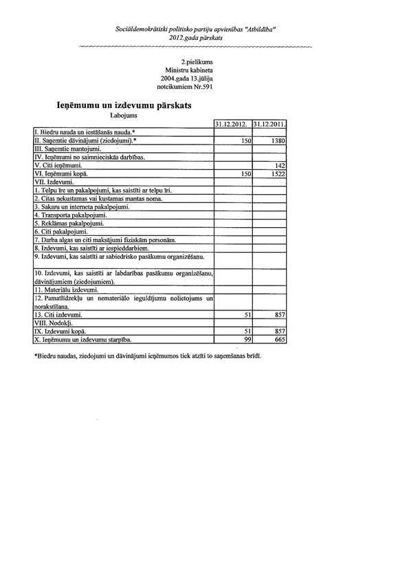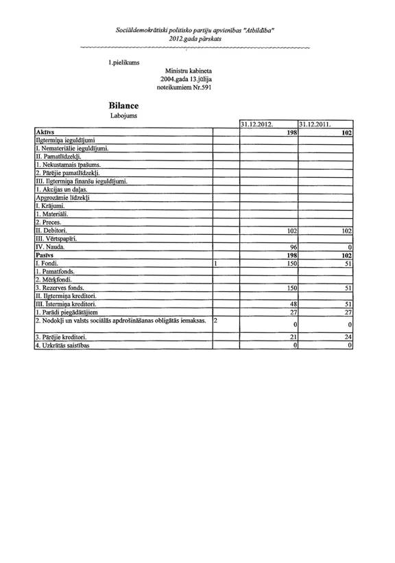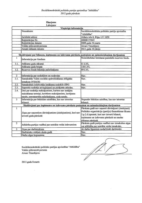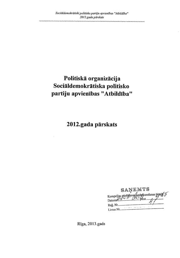 Politiskās organizācijas Sociāldemokrātiska politisko partiju apvienība "Atbildība" 2012.gada pārskats