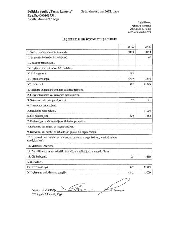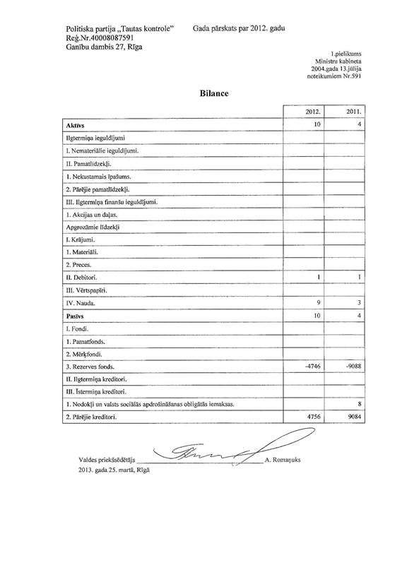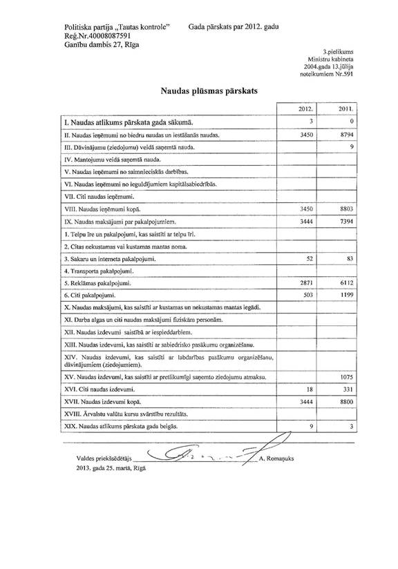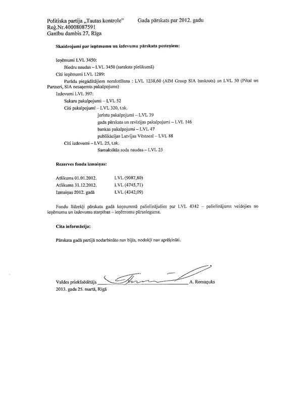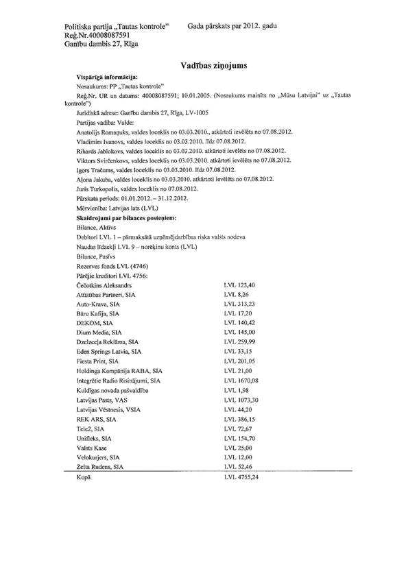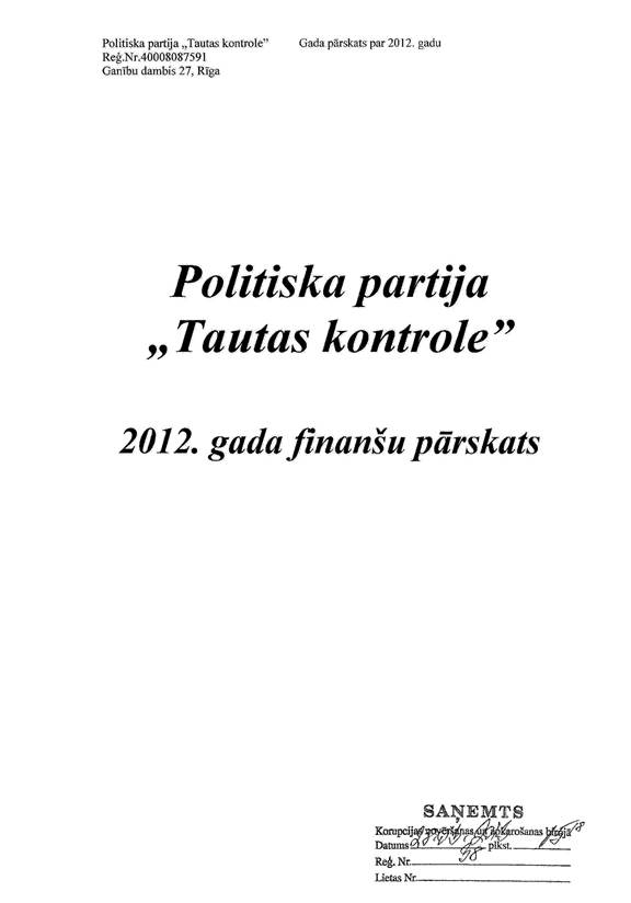 Politiskās partijas "Tautas kontrole" 2012.gada finanšu pārskats