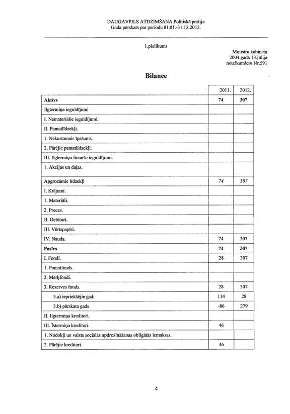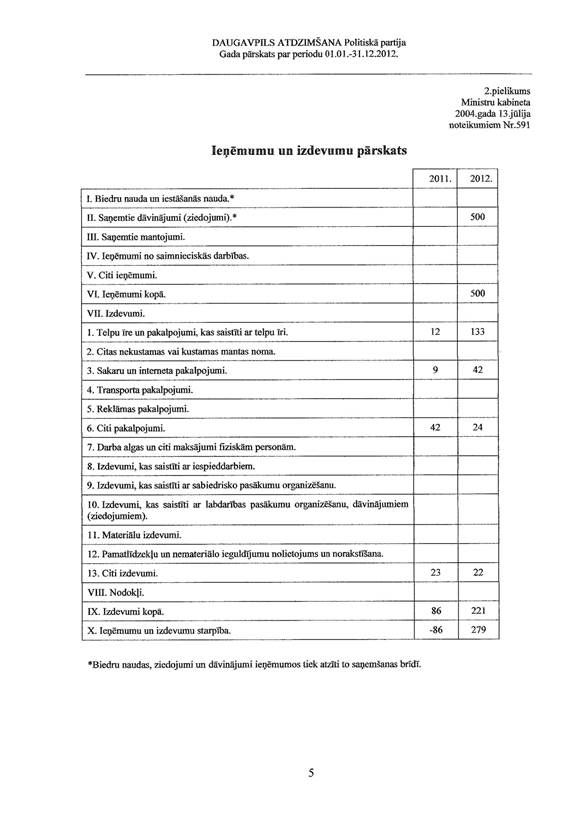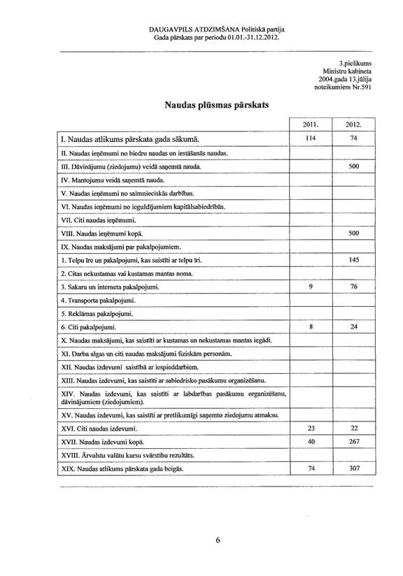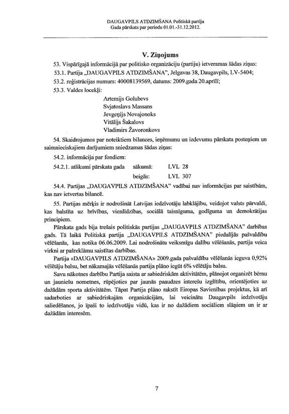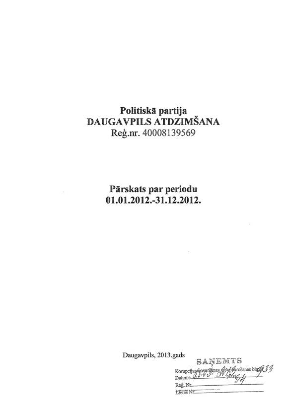 Politiskās partijas "DAUGAVPILS ATDZIMŠANA" pārskats par periodu 01.01.2012.- 31.12.2012.
