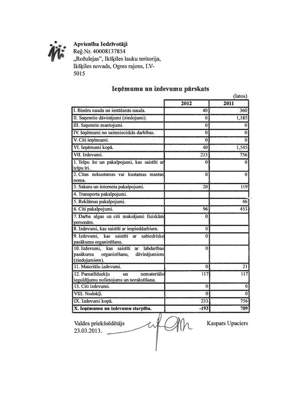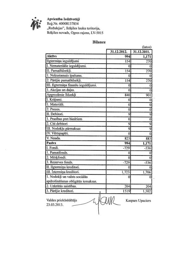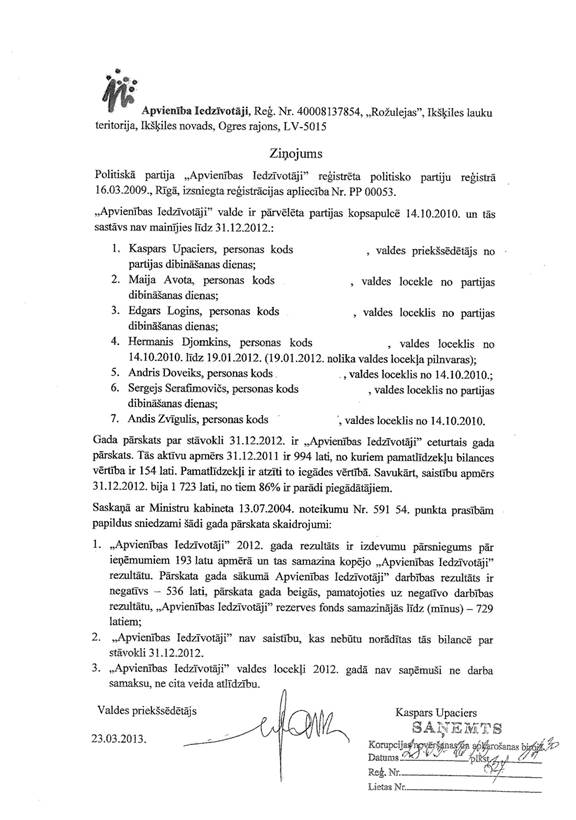 Politiskās partijas "Apvienība Iedzīvotāji" gada pārskats par 2012.gadu