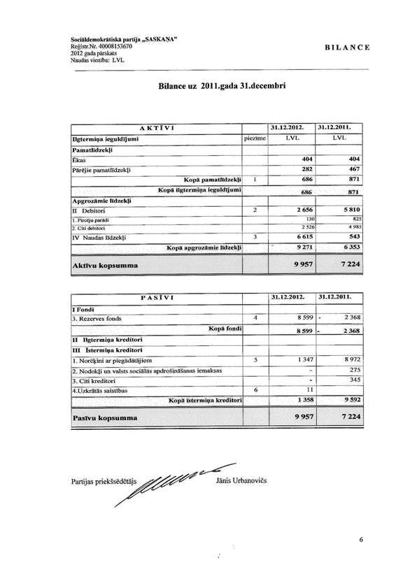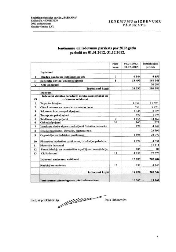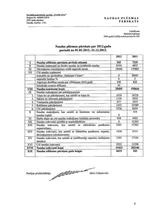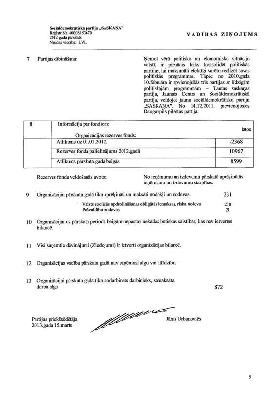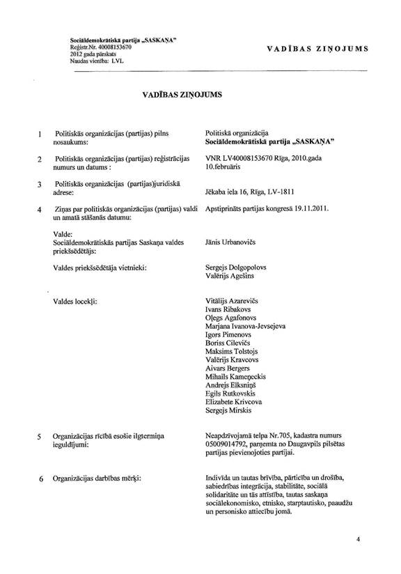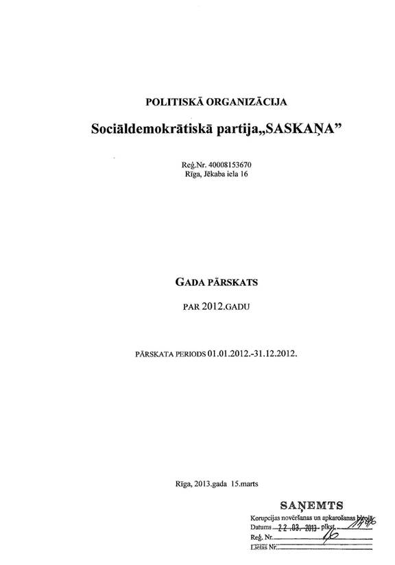 Politiskās partijas "Sociāldemokrātiskā partija ""Saskaņa" gada pārskats par 2012.gadu