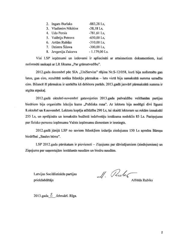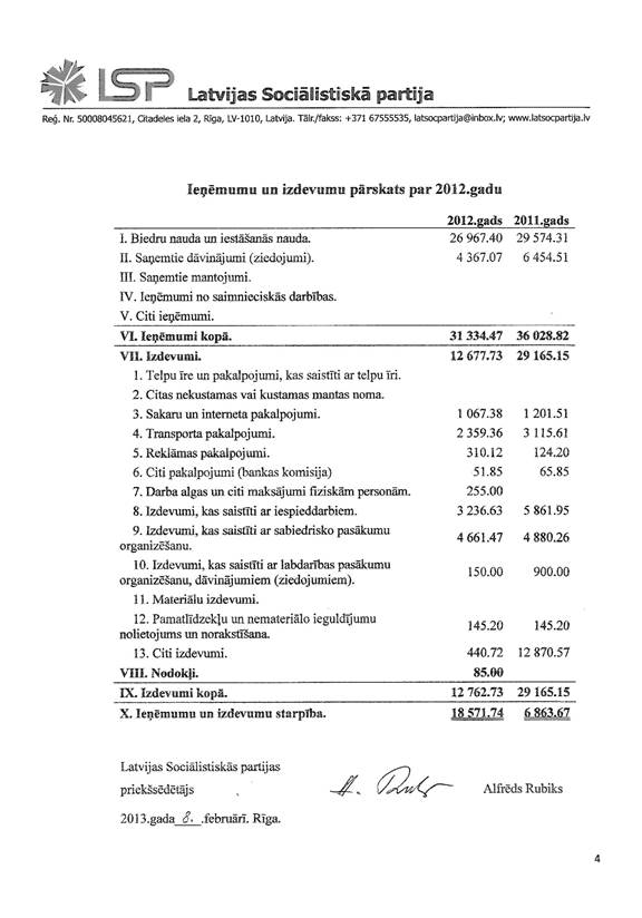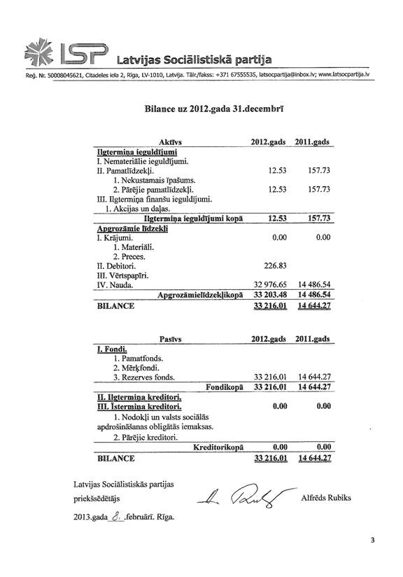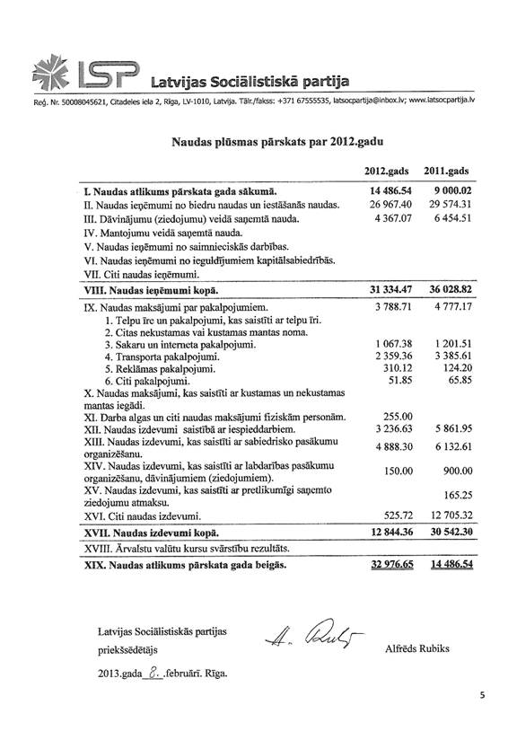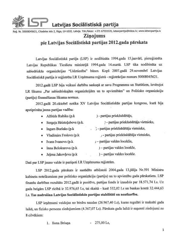 Politiskās partijas "Latvijas Sociālistiskā partija" gada pārskats par 2012.gadu