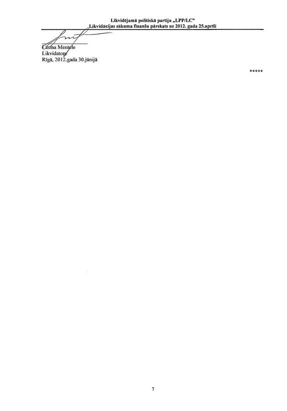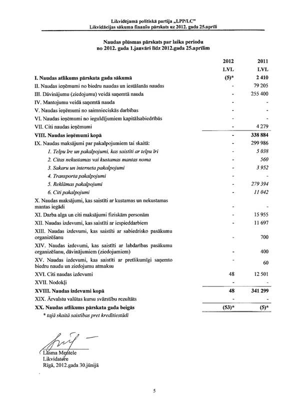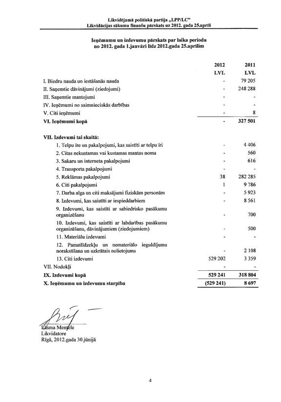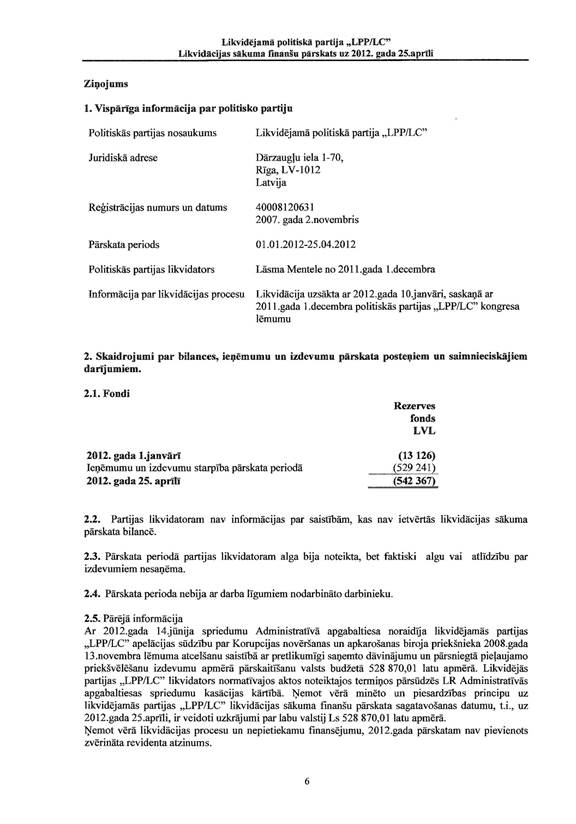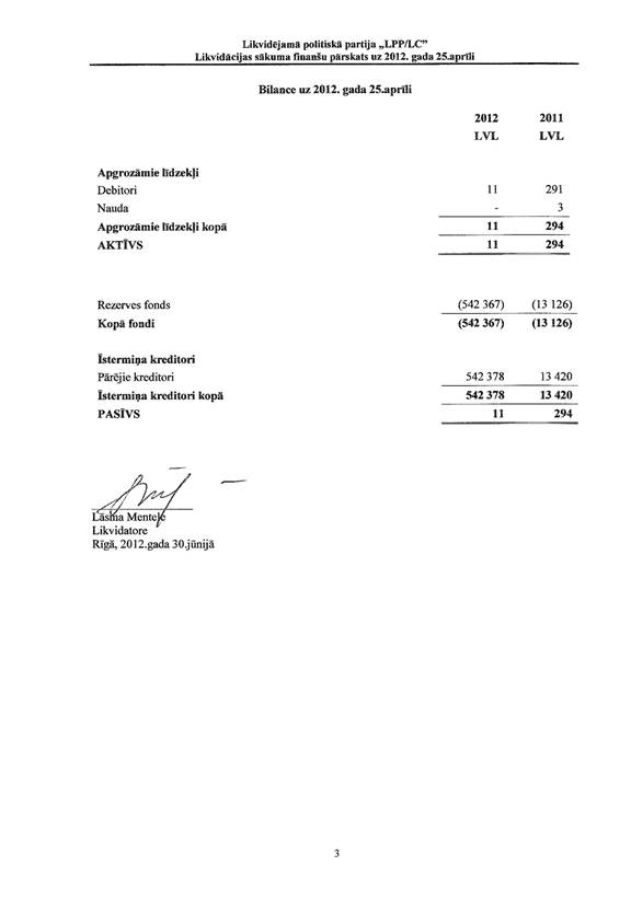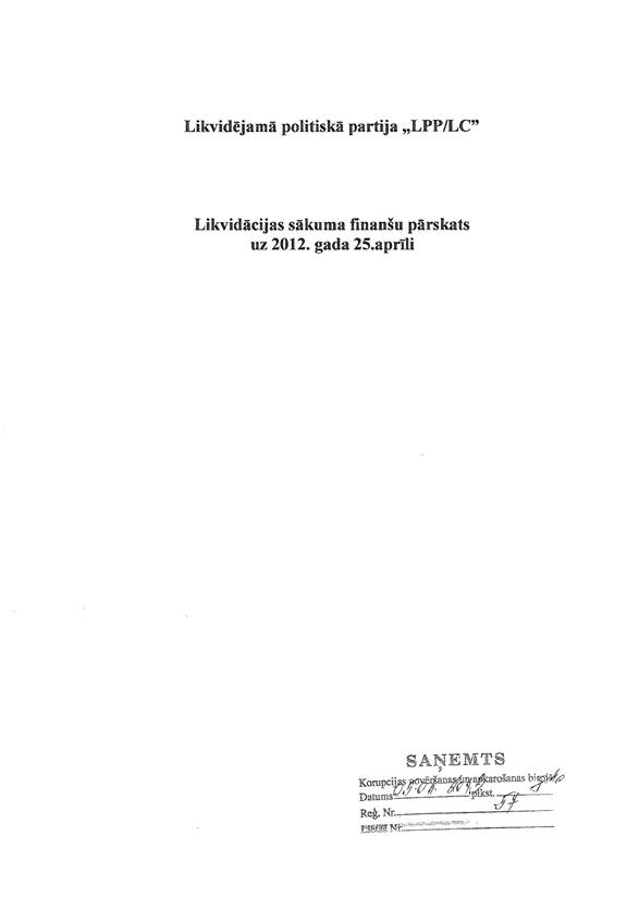 Likvidējamās politiskās partijas "LPP/LC" likvidācijas sākuma finanšu pārskats uz 2012.gada 25.aprīli