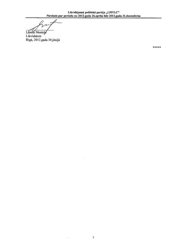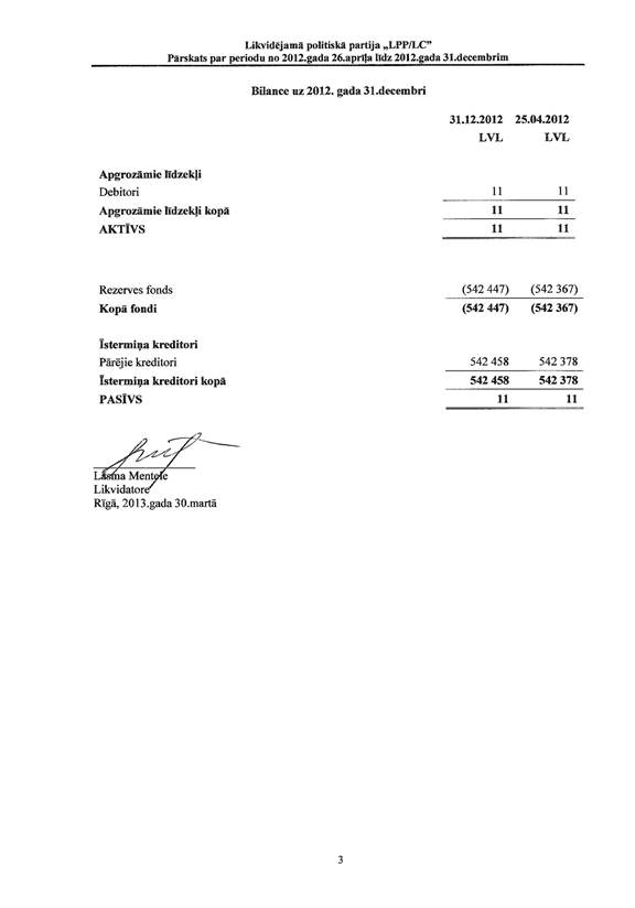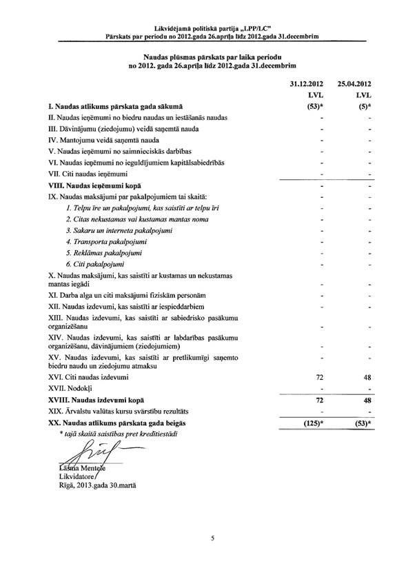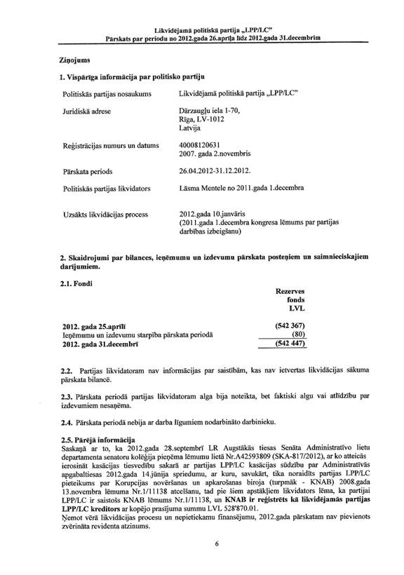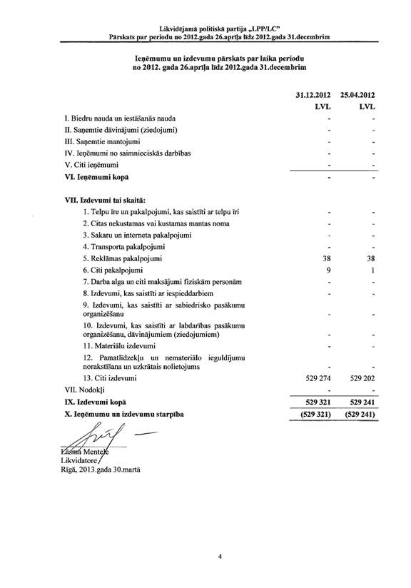 Likvidējamās politiskās partijas "LPP/LC" pārskats par periodu no 2012.gada 26.aprīļa līdz 2012.gada 31.decembrim