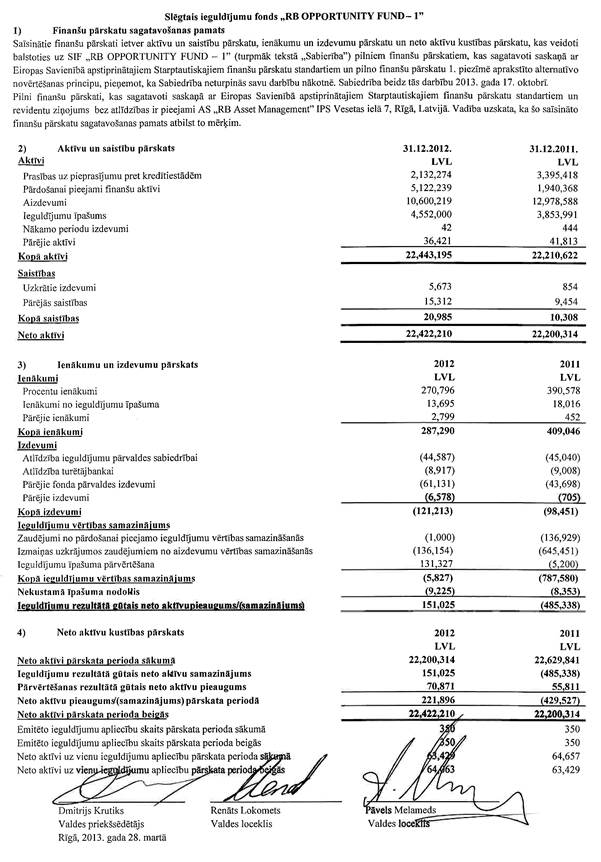 Pievienotie saīsinātie finanšu pārskati, kas ietver aktīvu un saistību pārskatu 2012.gada 31.decembrī, ienākumu un izdevumu pārskatu un neto aktīvu kustības pārskatu, ir sagatavoti, balstoties uz revidētajiem SIF ,,RB Opportunity fund I" finanšu pārskatiem par gadu, kas noslēdzās 2012.gada 31.decembrī. Par šiem finanšu pārskatiem mēs 2013.gada 28.martā izsniedzām revidentu atzinumu ar iebildi.