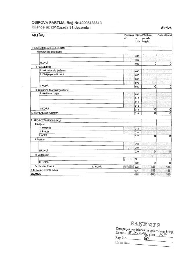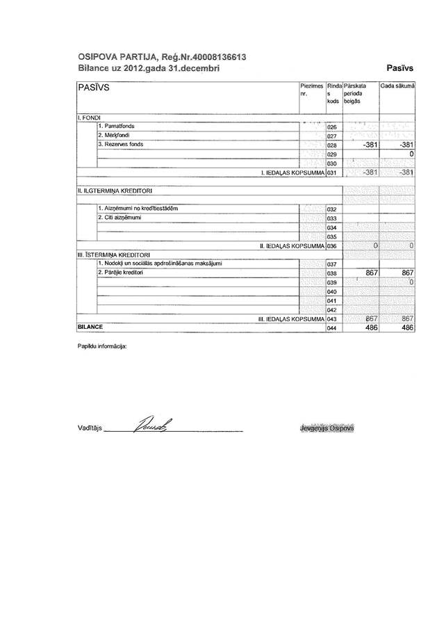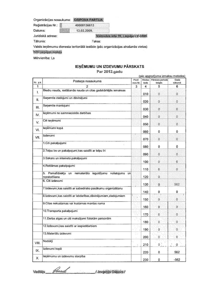 Politiskās partijas "Osipova partija" gada pārskats par 2012.gadu